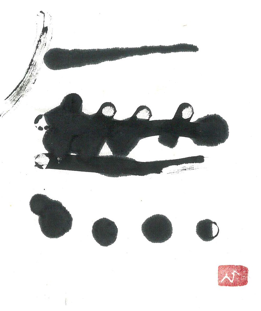 評:宿墨を使って基線の線とにじみがくっきりとでて、面白いですね。点の表情が可愛らしさをイメージさせます。ふわふわした柔らかさが線に表れている感じです。等間隔に書いていないので、動いているようにも見えます。