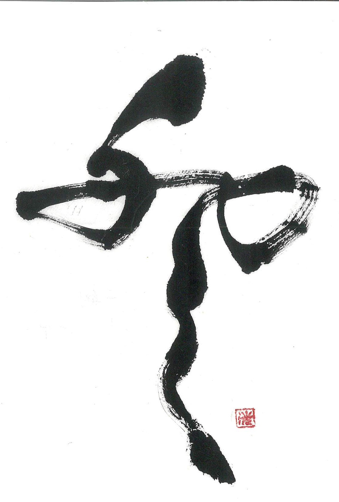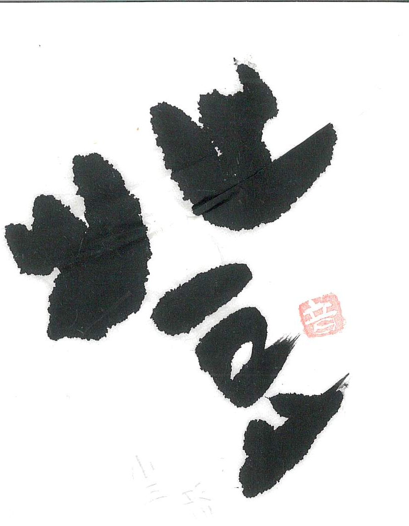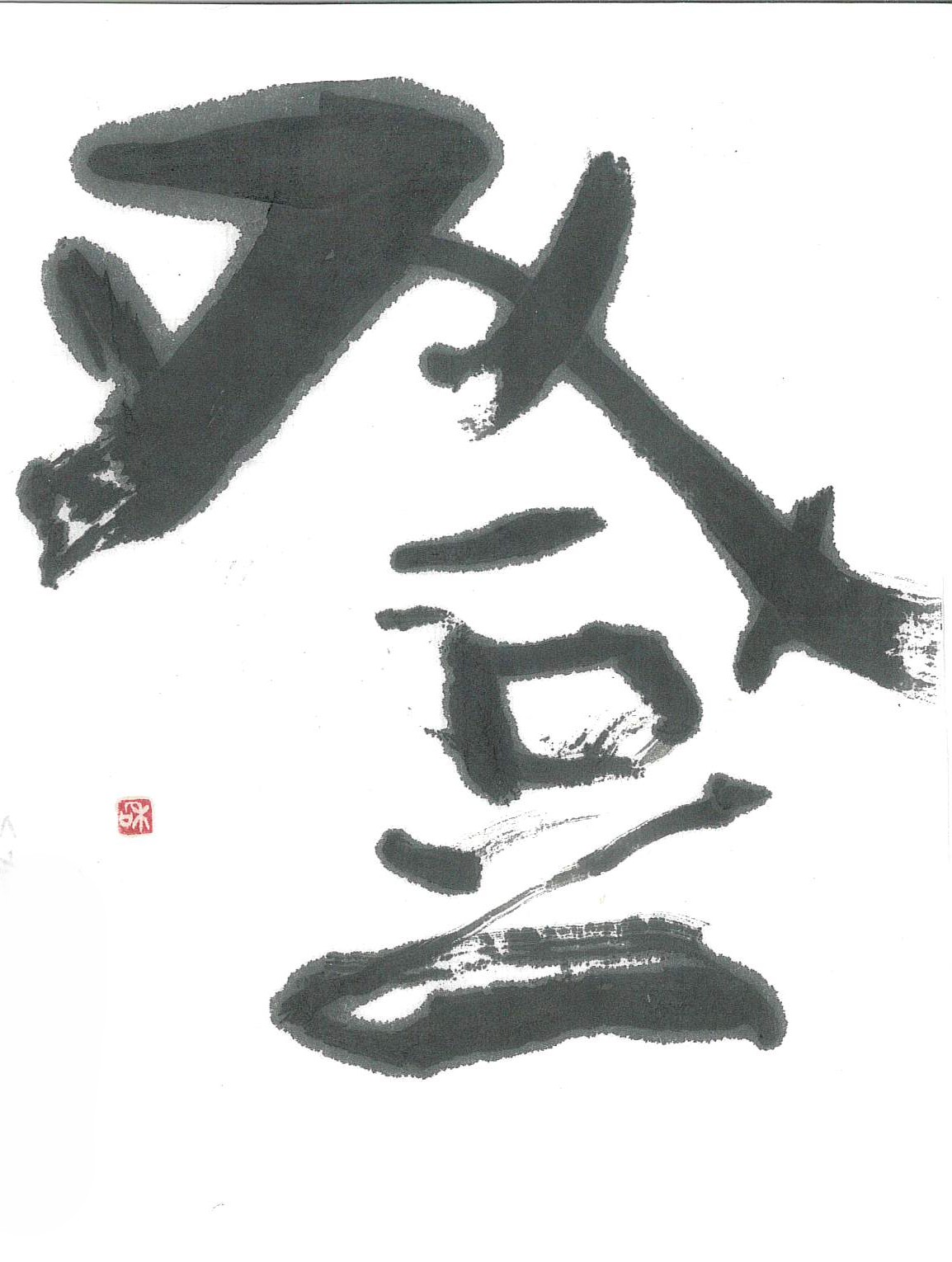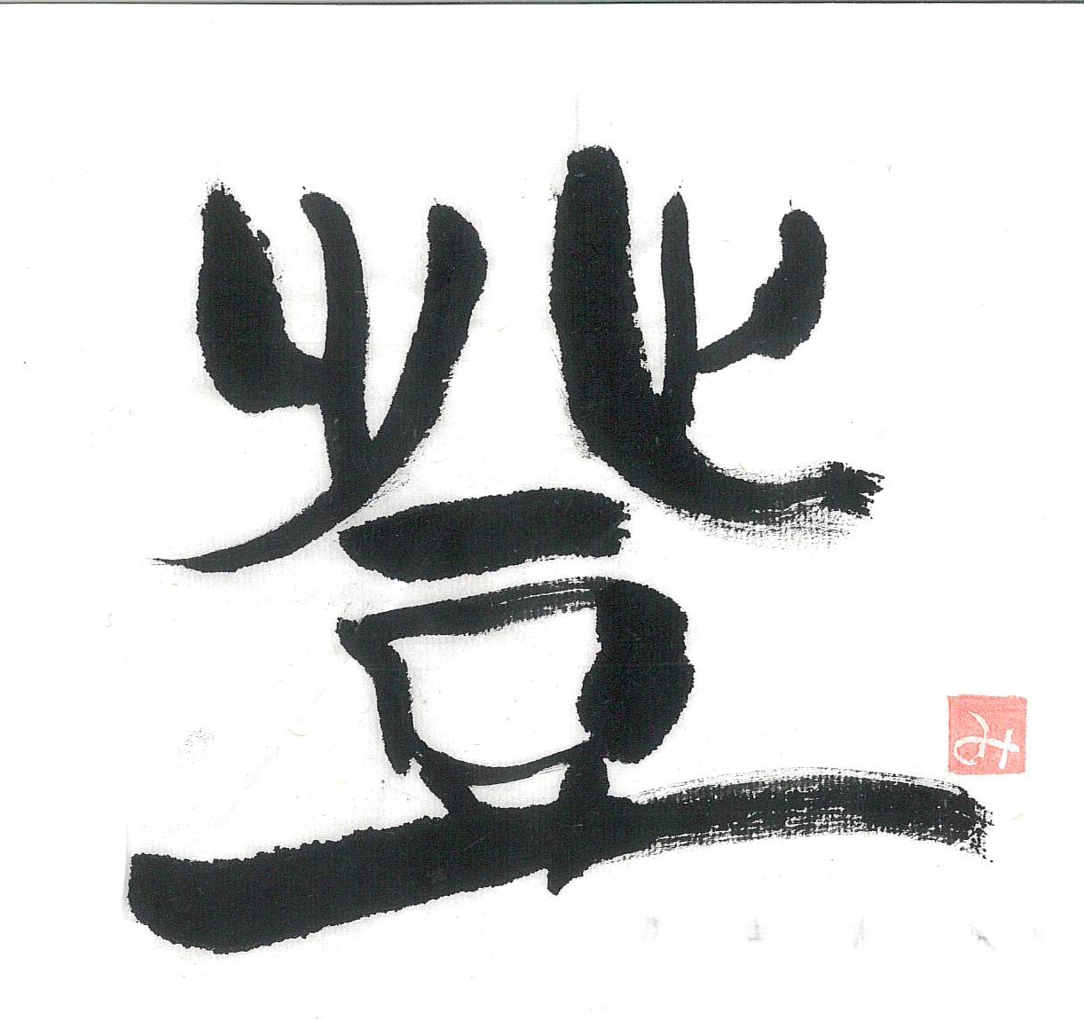 評:はつがしらが、しっかりしていて大きな山を登っているように思います。または大きな屋根のようにも見えますね。線が重たくならない様に潤渇もありよいと思います。こちらは配置は真ん中ですが、字の中の豆のバランスを変えたり、はつがしらの長さを変えたりと工夫されています。