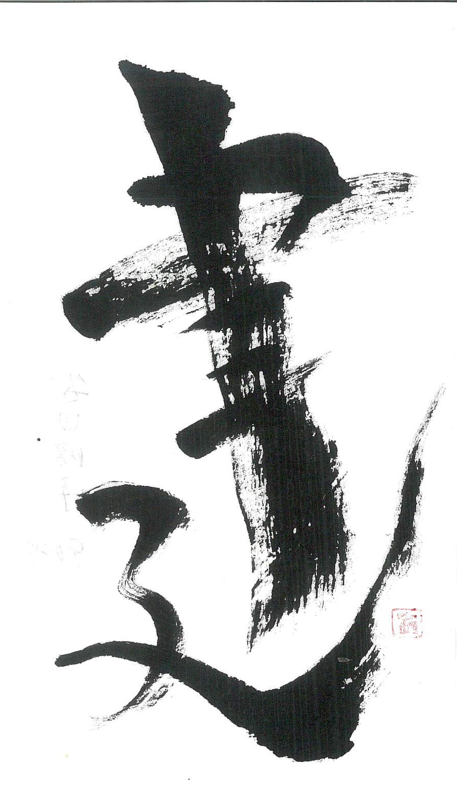 評:草書で書かれていて軽やかな作品になっています。細い紙を生かして縦長に書き、高い建物のようにも見えます。しんにょうをはみ出させているのが勢いを感じますね。