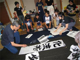 決まったあとは、すぐに書くのではなく、まず大きな筆で書く時の体の動きを学ぶ班も。
