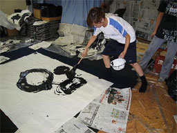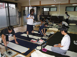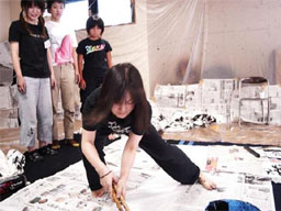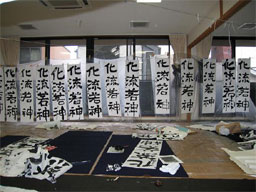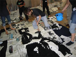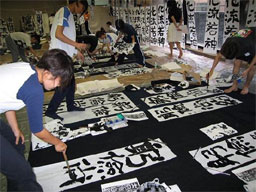 4つの班に分かれて、全紙3枚を継いだ紙に一文字を共同制作します。