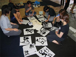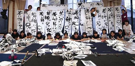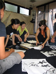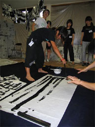 体を一杯に使って書く、筆の先を使って控えめな線を書く…前の人の線を受けて自分はどんな役割を果たすべきなのか、作品作りに欠かせない要素を、知らず知らずに学んでいきます。
